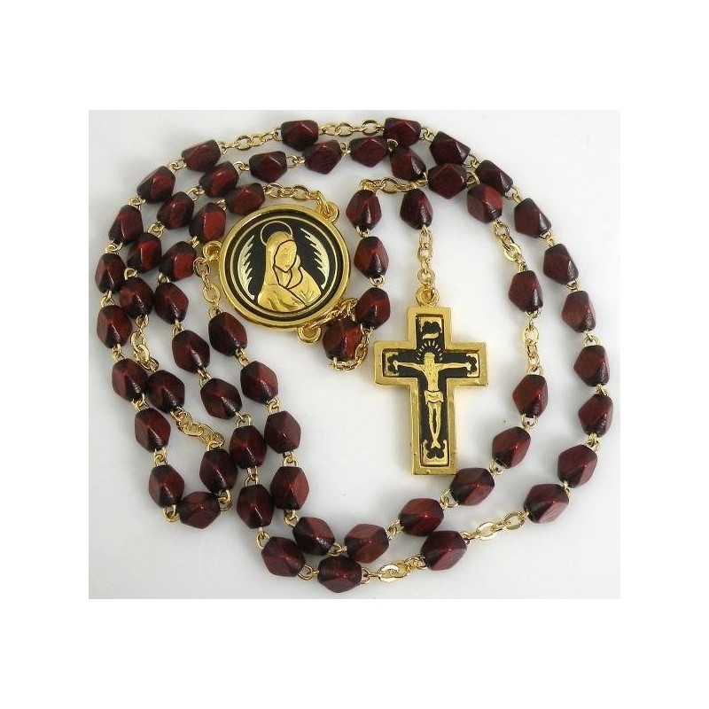 Beautiful Rosary Beads with handmade gold damascene design work featuring a Jesus Christ and The Virgin Mary design. This rosary has a total length measure of 46 cm. The rosary beads are red in color. The centerpiece is round in shape.