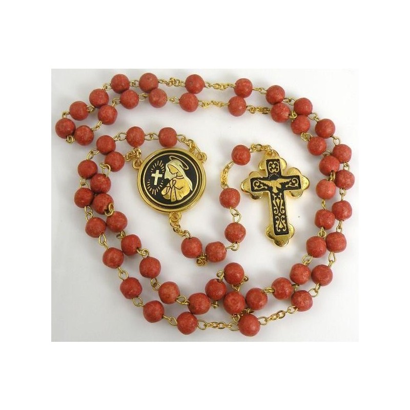 Beautiful Rosary Beads with handmade gold damascene design work featuring a dove, Symbol for the Holy Spirit, and The Virgin Mary design. This rosary has a total length measure of 50 cm. The rosary beads are red in color. The centerpiece is round in shape.