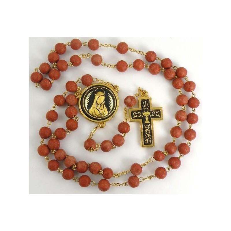 Beautiful Rosary Beads with handmade gold damascene design work featuring a chalice and The Virgin Mary design. This rosary has a total length measure of 50 cm. The rosary beads are red in color. The centerpiece is round in shape.