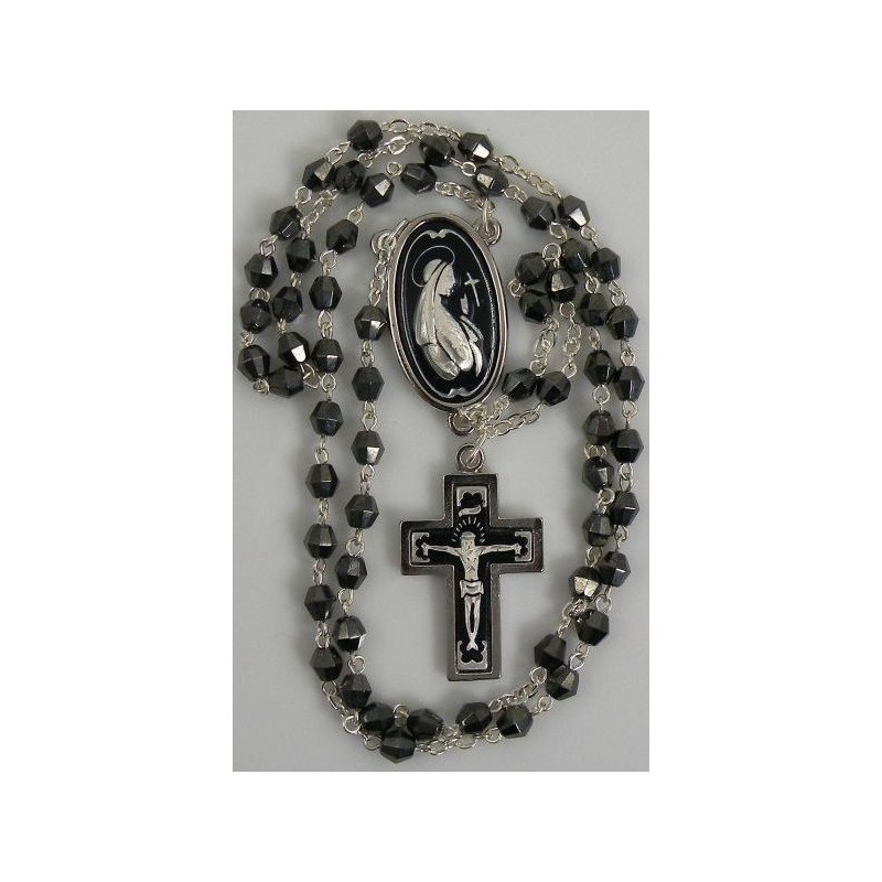 Beautiful Rosary Beads with handmade silver damascene design work featuring a Jesus Christ and The Virgin Mary design. This rosary has a total length measure of 41 cm. The rosary beads are black in color. The centerpiece is oval in shape.