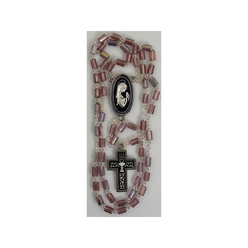 Beautiful Rosary Beads with handmade silver damascene design work featuring a chalice and The Virgin Mary design. This rosary has a total length measure of 45 cm. The rosary beads are purple in color. The centerpiece is oval in shape.