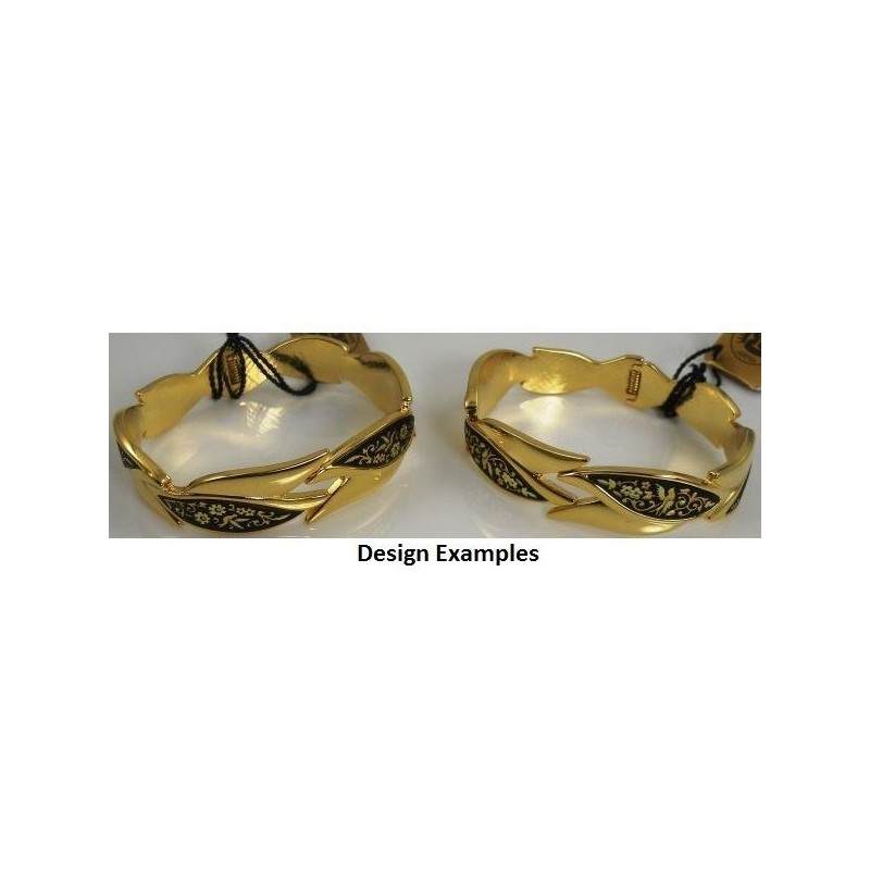 Beautiful bracelet with handmade gold damascene design work featuring a bird and flora design. This bracelet measures 50 mm x 62 mm.