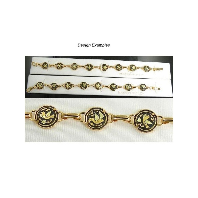 Beautiful link bracelet with handmade gold damascene design work featuring birds and flora design. The links of this bracelet measure 10mm and are round in shape. Overall length of bracelet is 7 inches.