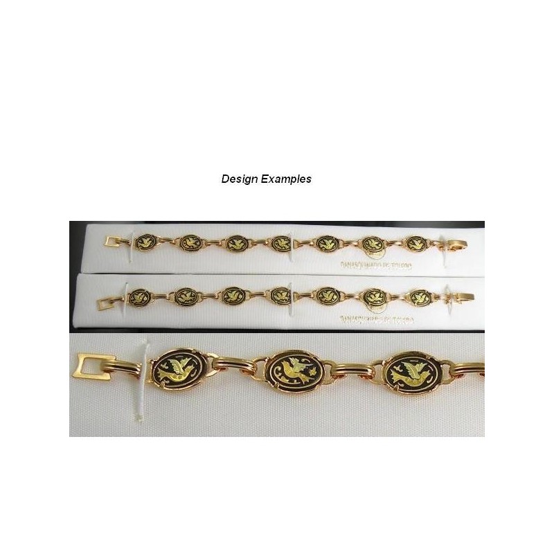 Beautiful link bracelet with handmade gold damascene design work featuring birds and flora design. The links of this bracelet measure 11 mm x 9 mm and are oval in shape. Overall length of bracelet is 6 1/2 inches.