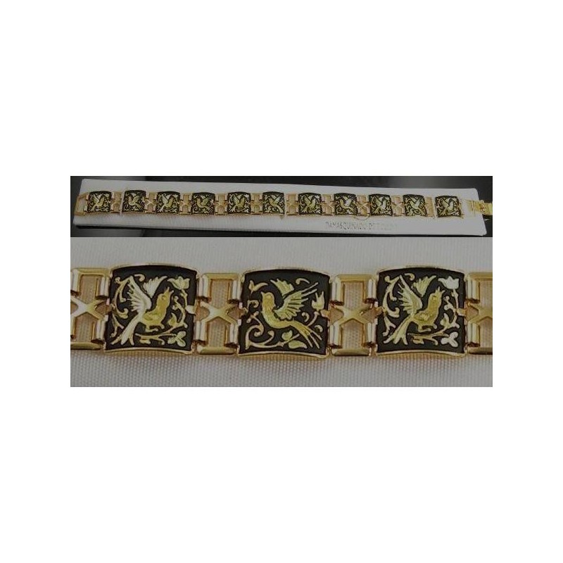 Beautiful link bracelet with handmade gold damascene design work featuring a bird and floral design. The links of this bracelet measure 12mm and are square in shape. Overall length of bracelet is 7 1/2 inches.
