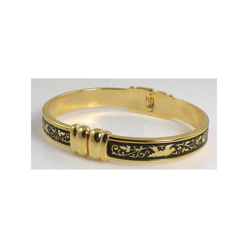 Beautiful bangle bracelet with handmade gold damascene design work featuring a bird and floral design. The bracelet measures 65 mm x 57 mm and is oval in shape.