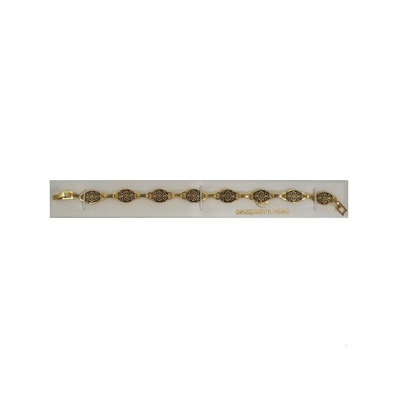 Beautiful link bracelet with handmade gold damascene design work featuring a Star of David design. The links of this bracelet measure 10 mm x 9 mm and are oval in shape. Overall length of bracelet is 7 inches.