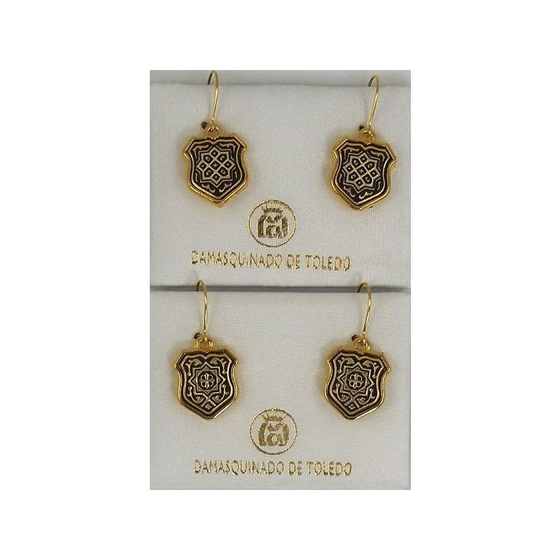 Damascene Gold Geometric Shield Earrings. Damascene Jewelry by Midas of Toledo Spain. Golden Earrings. Damascene Womens Jewelry.