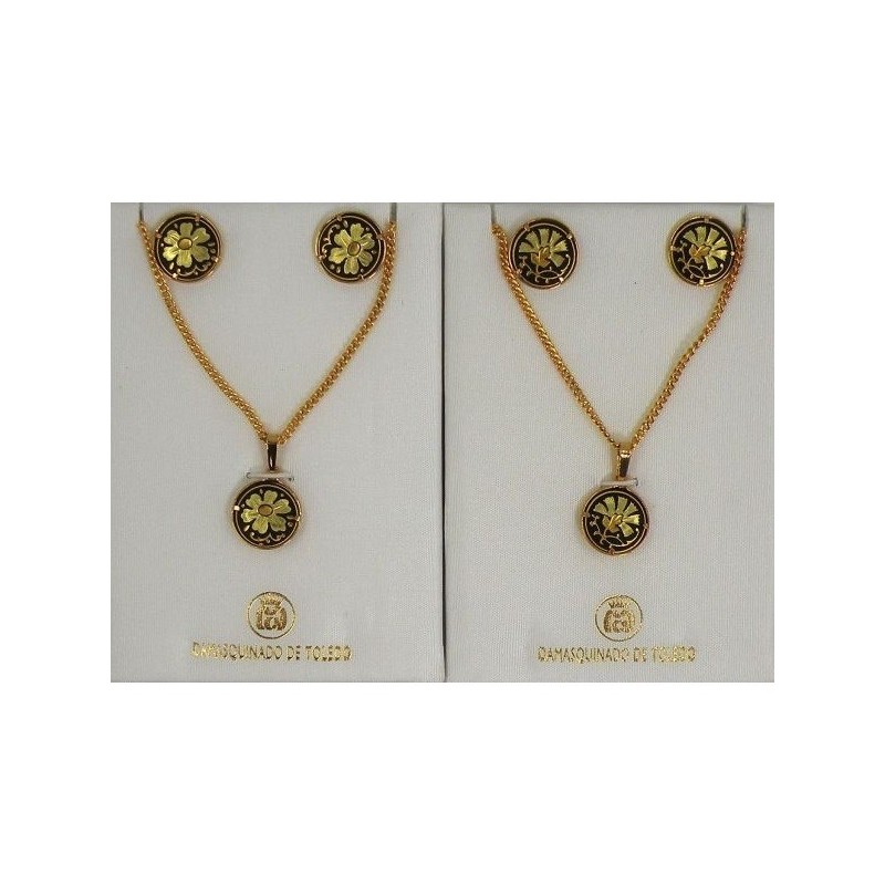 Damascene Gold Flower Earrings and Necklace Style 3433. Damascene Jewelry by Midas of Toledo Spain. Golden Earrings and Pendant. Damascene Womens Jewelry.