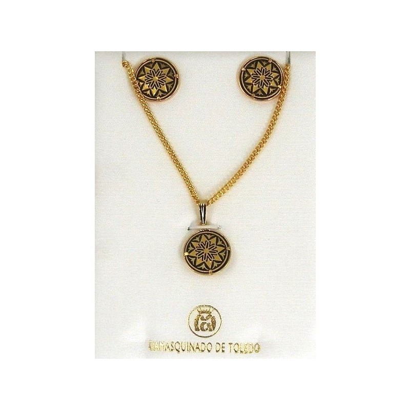 Damascene Gold Star Earrings and Necklace Style 3433. Damascene Jewelry by Midas of Toledo Spain. Golden Earrings and Pendant. Damascene Womens Jewelry.