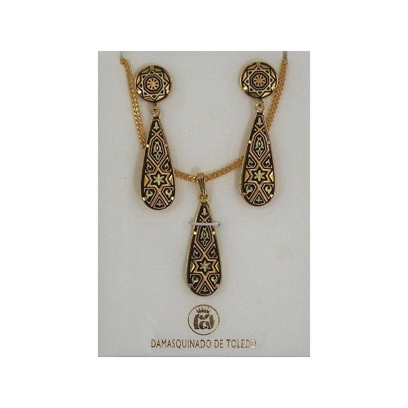 Beautiful pierce stud earrings with handmade gold damascene design work featuring Star of David designs. The tear drop shaped earrings measure 47 mm in length with a 12 mm round stud at top and a 30 mm x 12 mm tear drop. Set includes a matching pendant on a Gold chain.