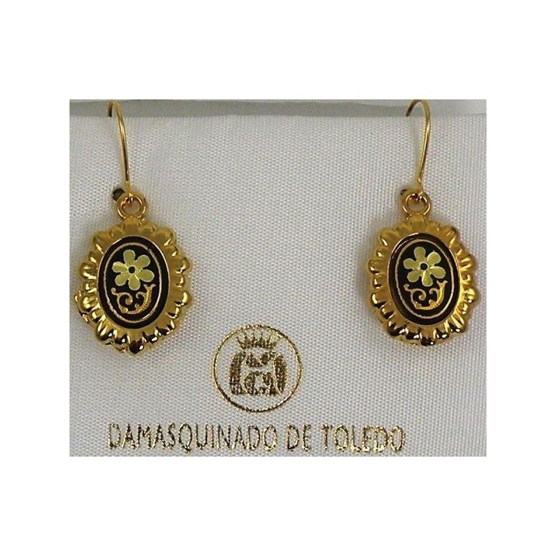 Damascene Gold Flower Oval Drop Earrings. Damascene Jewelry by Midas of Toledo Spain. Unique damascene design. Golden Earrings.