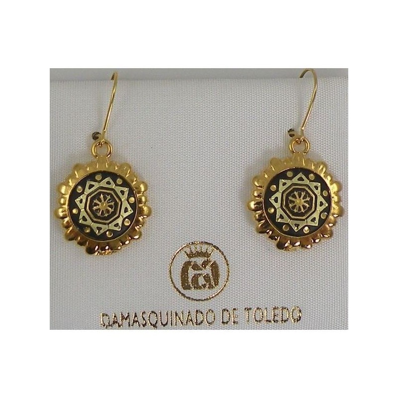 Damascene Gold Star Round Drop Earrings style 8103. Damascene Jewelry by Midas of Toledo Spain. Golden Earrings.