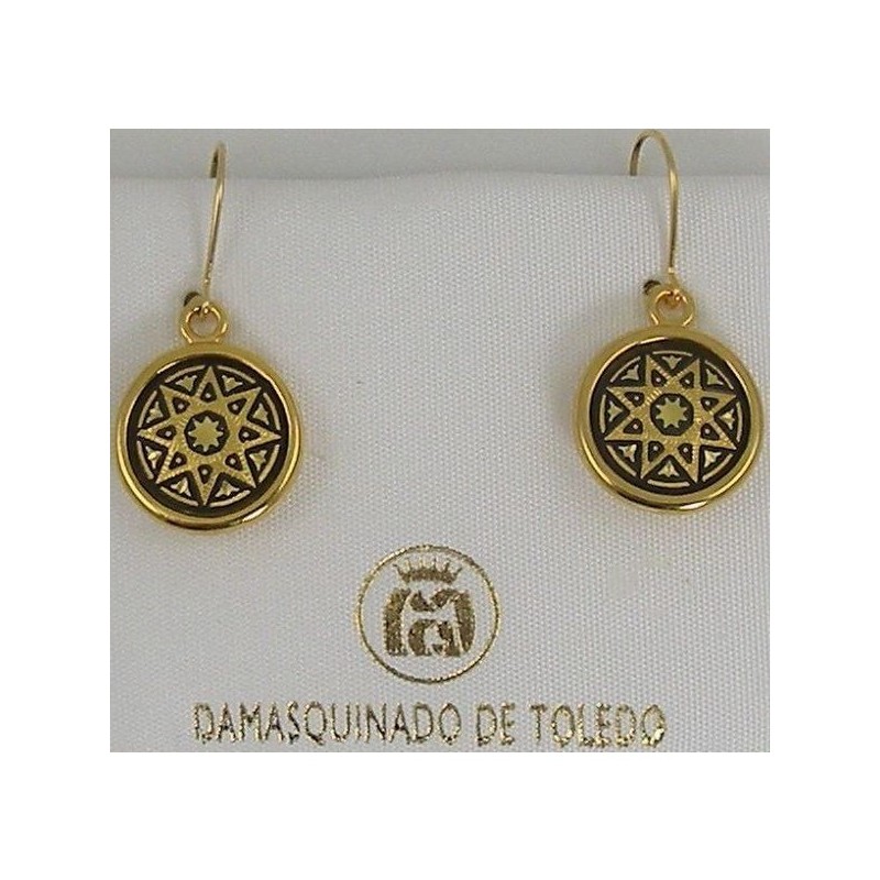 Damascene Gold Star Round Drop Earrings style 8102. Damascene Jewelry by Midas of Toledo Spain. Golden Earrings.