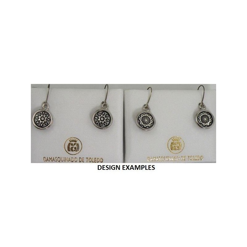 Damascene Silver Drop Earrings Star 12mm Round. Damascene Jewelry by Midas of Toledo Spain. Silver Earrings.