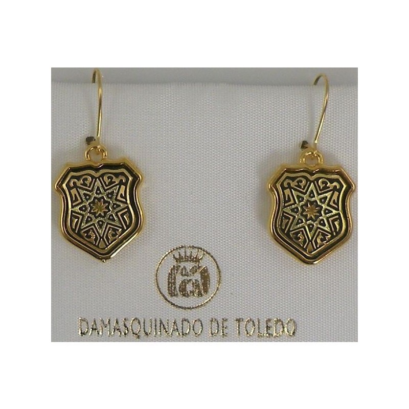 Damascene Gold Star Shield Drop Earrings. Damascene Jewelry by Midas of Toledo Spain. Golden Earrings.