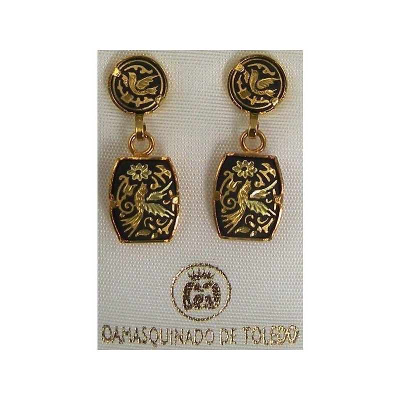 Damascene Gold Bird Rectangle Drop Earrings style 3114. Damascene Jewelry by Midas of Toledo Spain. Golden Earrings. Damascene womens jewelry.