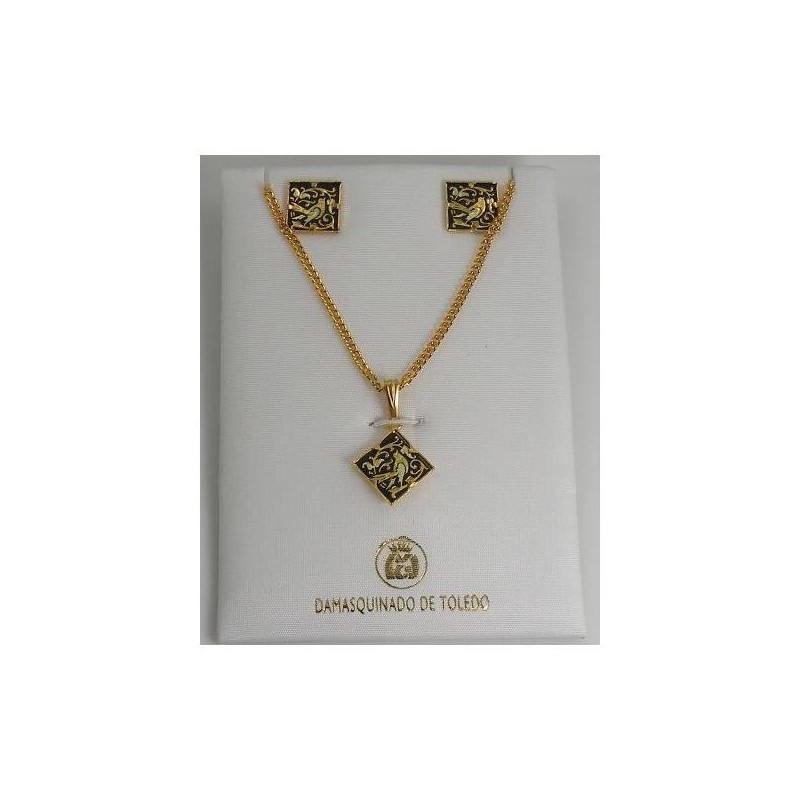 Damascene Gold Square Bird Earrings Necklace Set. Damascene Jewelry by Midas of Toledo Spain. Golden Necklace and Earrings. Damascene Womens Jewelry.