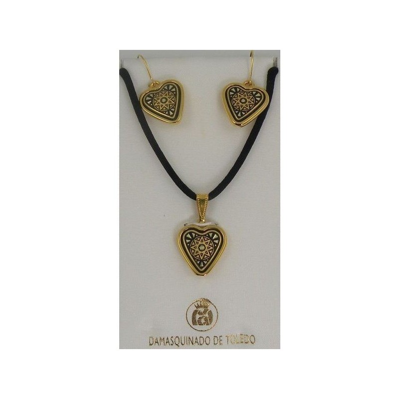 Damascene Gold Star Heart Pendant and Earrings Set. Damascene Jewelry by Midas of Toledo Spain. Golden Necklace and Earrings. Damascene Womens Jewelry.