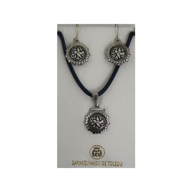Damascene Silver Bird Round Pendant Earrings Set. Damascene Jewelry by Midas of Toledo Spain. Silver Necklace and Earrings. Damascene Womens Jewelry.