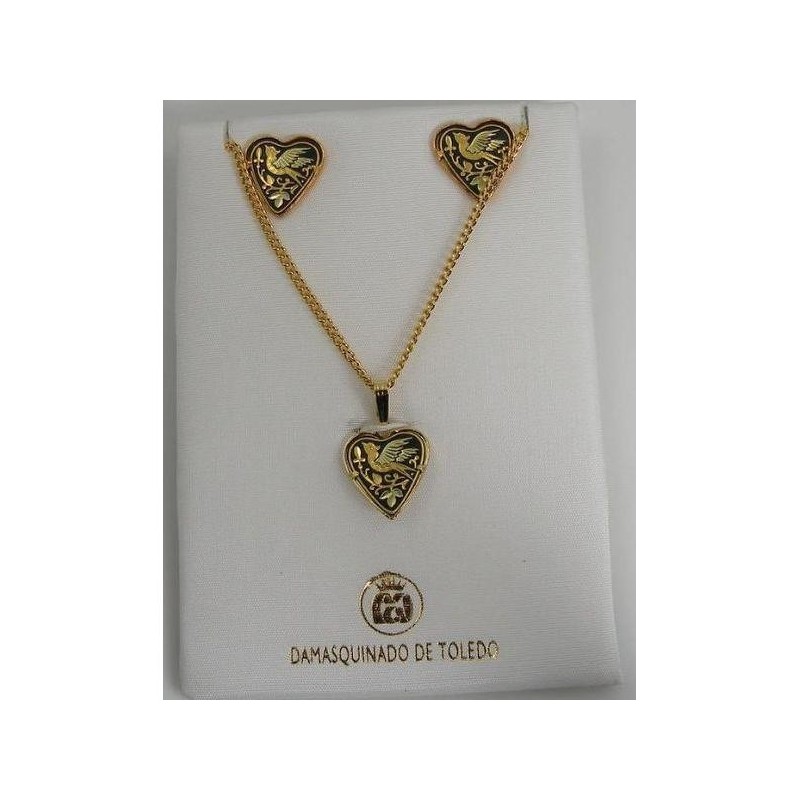 Damascene Gold Heart Bird Earrings Necklace Set. Damascene Jewelry by Midas of Toledo Spain. Golden Necklace and Earrings. Damascene Womens Jewelry.