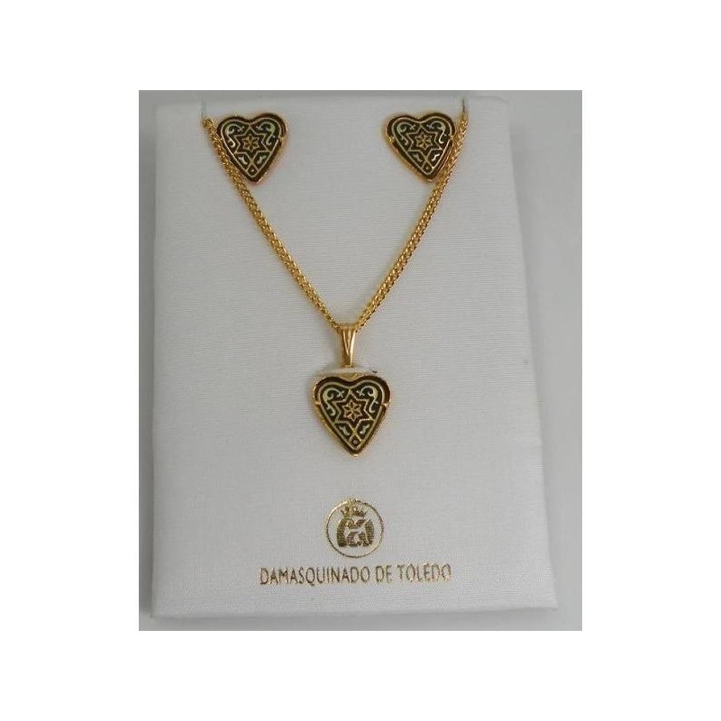 Damascene Gold Heart Star Earrings Necklace Set. Damascene Jewelry by Midas of Toledo Spain. Golden Necklace and Earrings. Damascene Womens Jewelry.