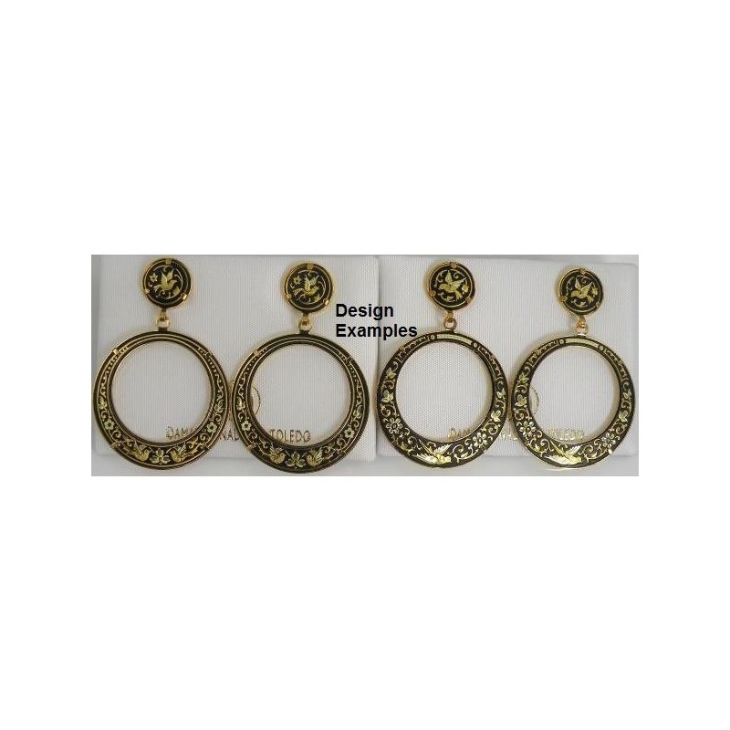 Damascene Gold Bird 33mm Round Drop Earrings. Damascene Jewelry by Midas of Toledo Spain. Golden Earrings. Damascene Womens Jewelry.