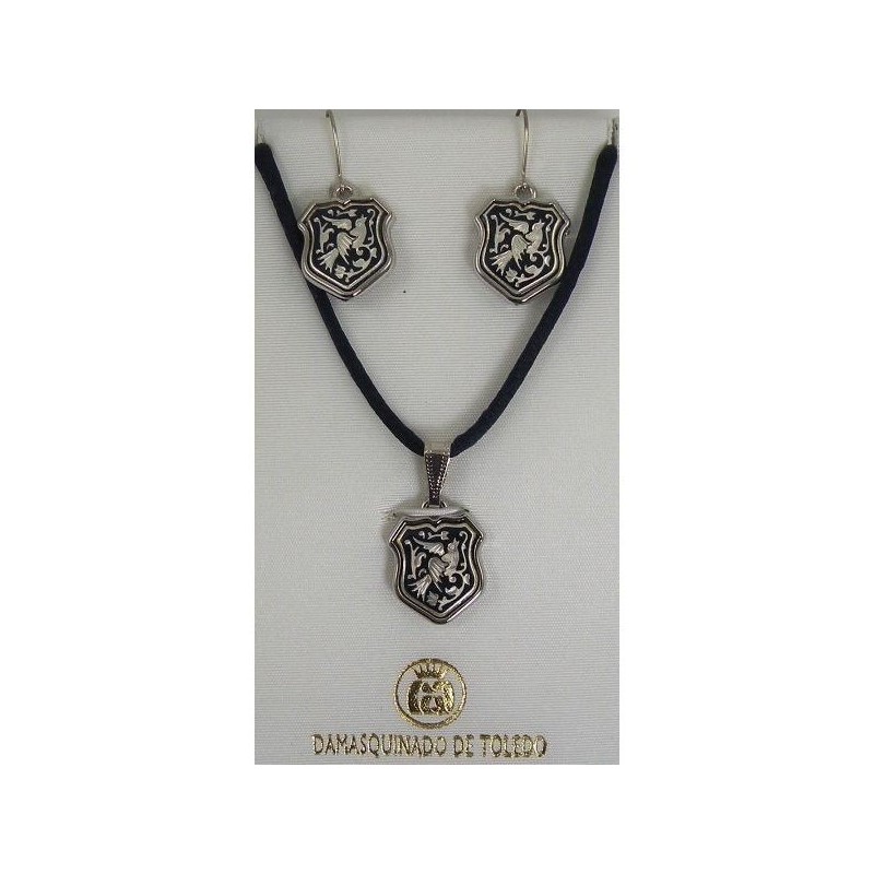 Damascene Silver Bird Shield Pendant and Earrings. Damascene Jewelry by Midas of Toledo Spain. Silver Necklace and Earrings. Damascene Womens Jewelry.