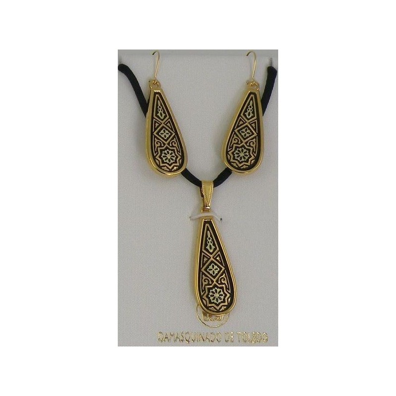 Damascene Gold Geometric Teardrop Pendant and Earrings. Damascene Jewelry by Midas of Toledo Spain. Golden Necklace and Earrings. Damascene Womens Jewelry.