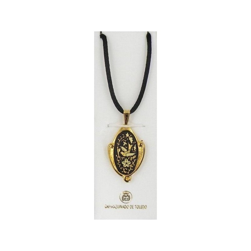Damascene Gold Bird Oval Pendant style 8221. Damascene Jewelry by Midas of Toledo Spain. Golden Necklace. Damascene Womens Jewelry.