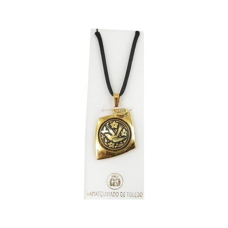 Beautiful pendant with handmade gold damascene design work featuring a bird and flora design. This pendant measures 27 mm x 25 mm and is kite in shape. Pendant comes with a black cord necklace at no extra charge.