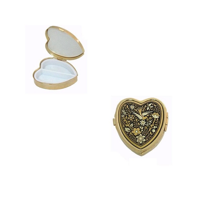 Beautiful pill box with handmade gold damascene design work featuring a bird and floral pattern design. This pill box measures 47 mm x 41 mm with a 16 mm depth and is heart shape. Contains 2 compartments for pills.