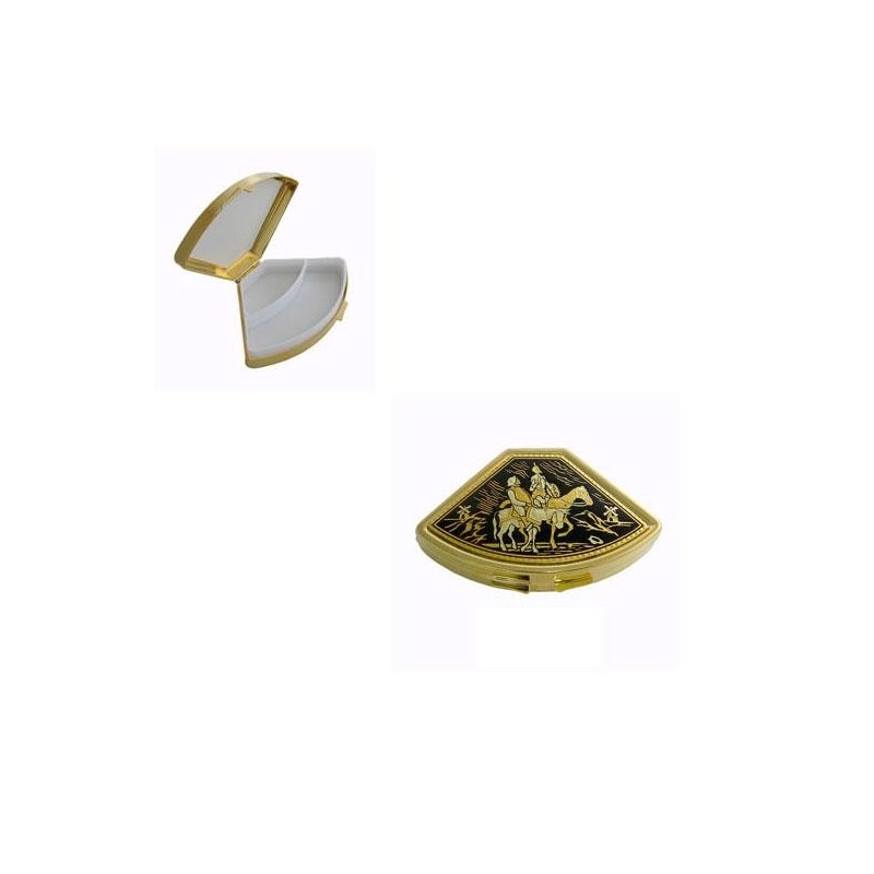 Beautiful pill box with handmade gold damascene design work featuring a Don Quixote design. This pill box measures 71 mm x 46 mm with a 15 mm depth and is fan shape. Contains 2 compartments for pills.