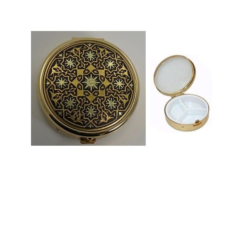 Beautiful pill box with handmade gold damascene design work featuring a geometric star pattern design. This pill box measures 50 mm with a 22 mm depth and is round shape. Contains 3 compartments for pills.