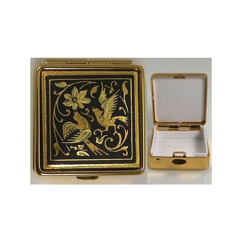 Beautiful pill box with handmade gold damascene design work featuring a bird and flora design. This pill box measures 29 mm with a 14 mm depth and is square in shape. Contains 1 compartment for pills.