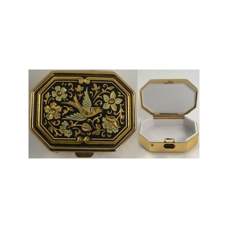 Beautiful pill box with handmade gold damascene design work featuring a bird and flora design. This pill box measures 28 mm x 38 mm with a 13 mm depth and is octagon in shape. Contains 1 compartment for pills.
