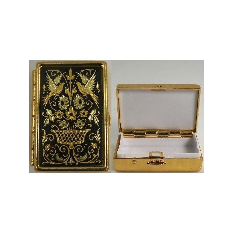 Beautiful pill box with handmade gold damascene design work featuring a bird and flora design. This pill box measures 26 mm x 41 mm with a 13 mm depth and is rectangle in shape. Contains 1 compartment for pills.