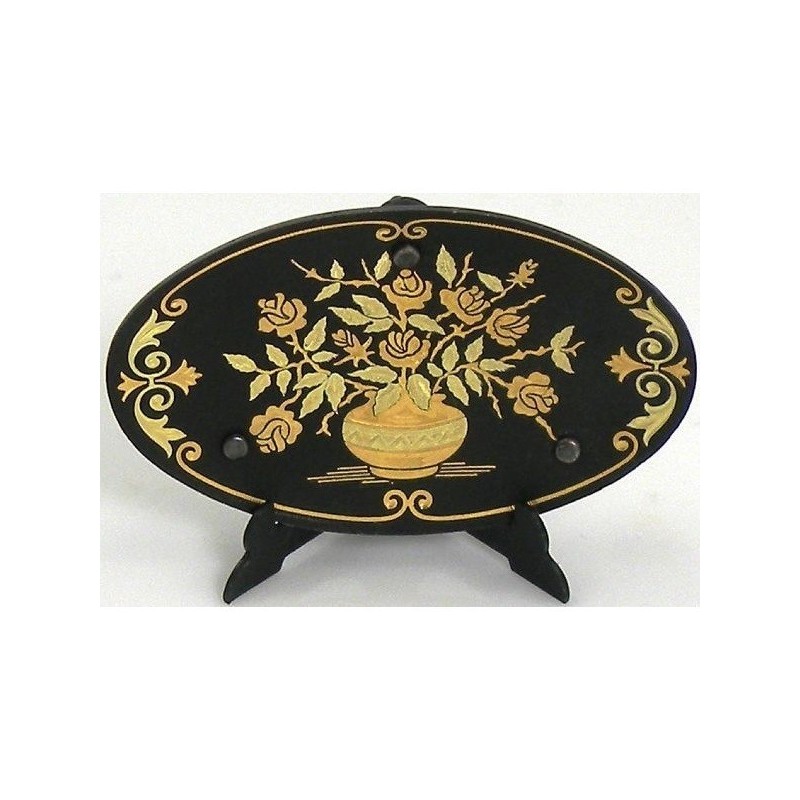 Beautiful decorative display plate with handmade gold damascene design work featuring a flower vase design. This plate is oval in shape and measures 6 cm x 4 cm. Plate comes with a display stand at no extra cost.