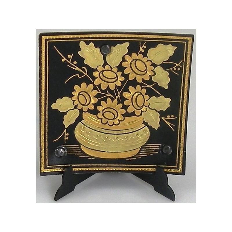 Beautiful decorative display plate with handmade gold damascene design work featuring a flower vase design. This plate is square in shape and measures 4.5 cm x 4.5 cm. Plate comes with a display stand at no extra cost.