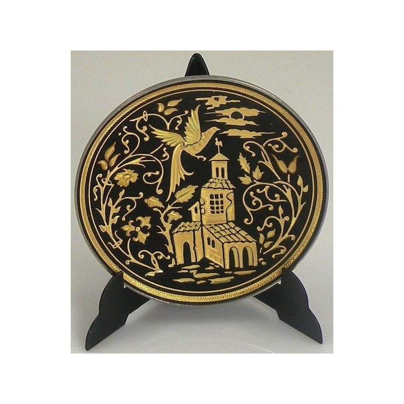 Beautiful decorative display plate with handmade gold damascene design work featuring a bird and church scene design. This plate is round in shape and measures 6 cm in diameter. Plate comes with a display stand at no extra cost.