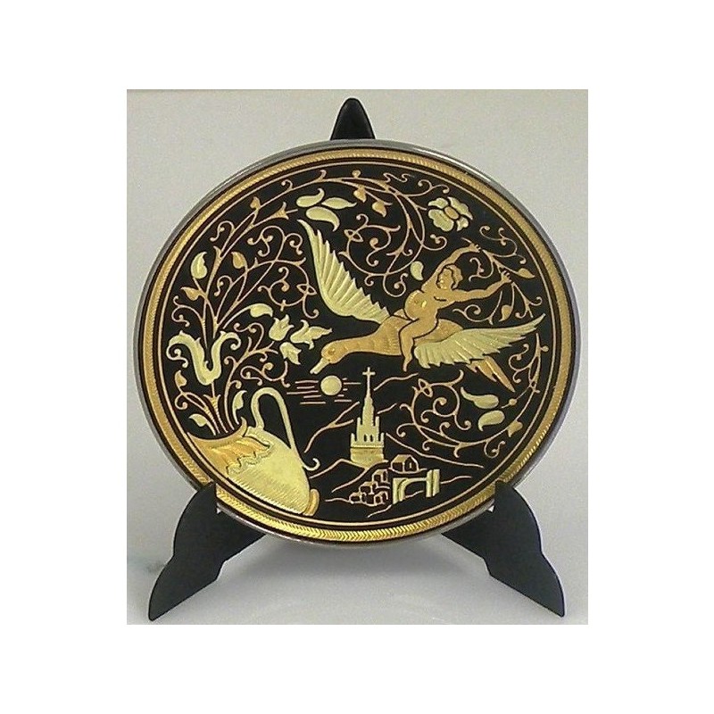 Beautiful decorative display plate with handmade gold damascene design work featuring a bird and floral design. This plate is round in shape and measures 6 cm in diameter. Plate comes with a display stand at no extra cost.