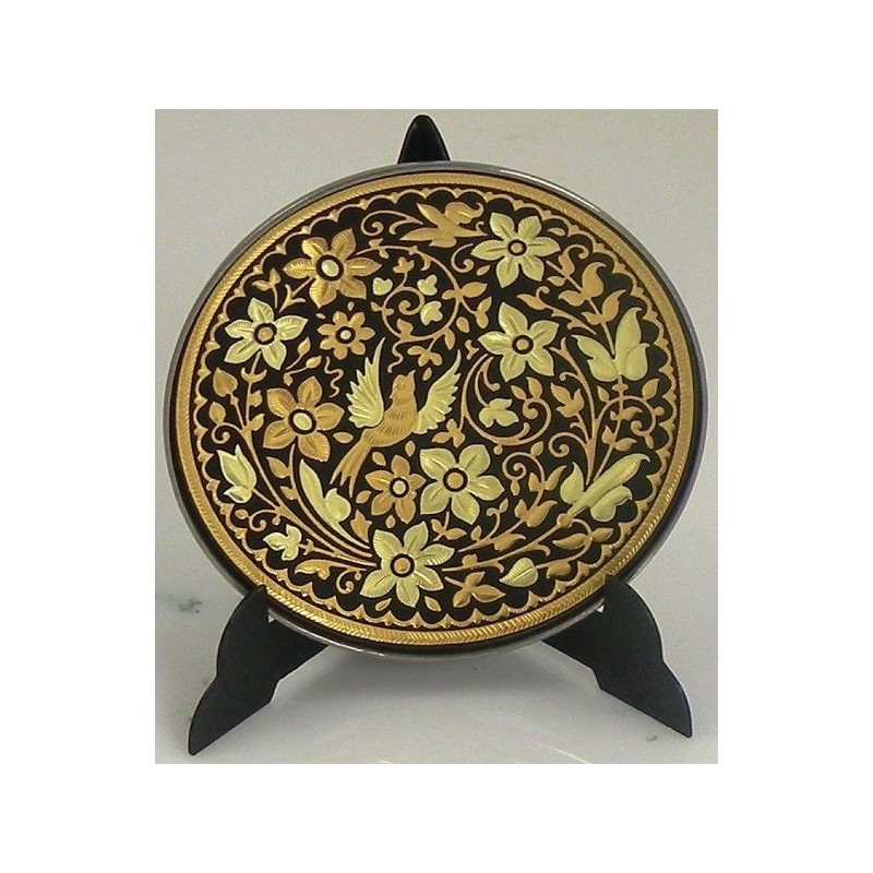 Beautiful decorative display plate with handmade gold damascene design work featuring a bird and floral design. This plate is round in shape and measures 6 cm in diameter. Plate comes with a display stand at no extra cost.