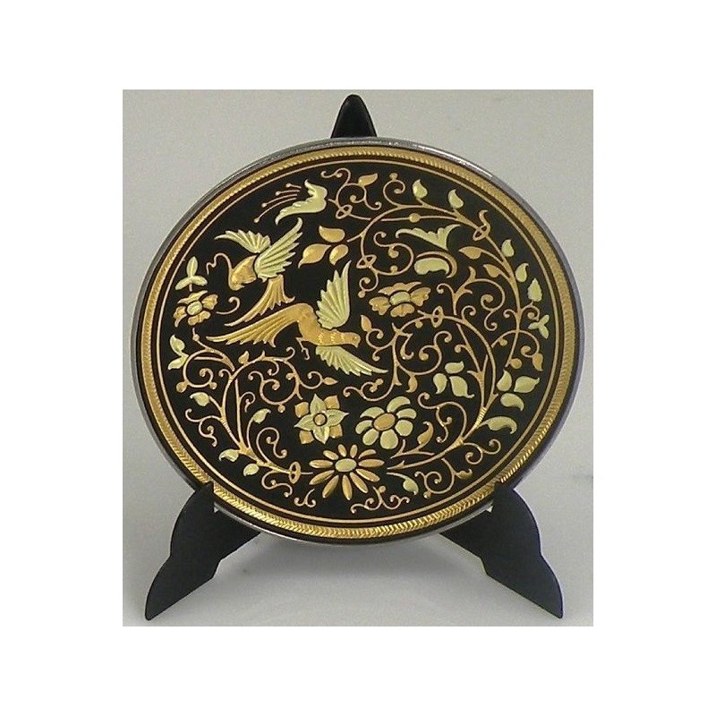 Beautiful decorative display plate with handmade gold damascene design work featuring a bird and floral design. This plate is round in shape and measures 6 cm in diameter. Plate comes with a display stand at no extra cost.