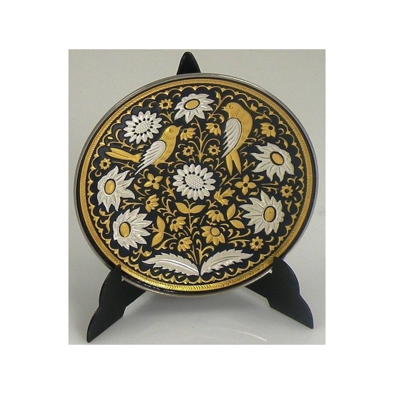 Beautiful decorative display plate with handmade gold and silver damascene design work featuring a bird and floral design. This plate is round in shape and measures 6 cm in diameter. Plate comes with a display stand at no extra cost.