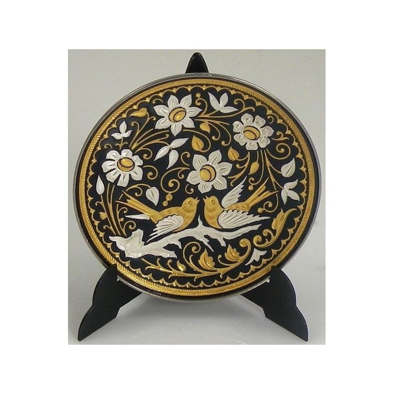 Beautiful decorative display plate with handmade gold and silver damascene design work featuring a bird and floral design. This plate is round in shape and measures 6 cm in diameter. Plate comes with a display stand at no extra cost.