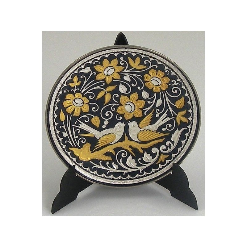 Beautiful decorative display plate with handmade gold and silver damascene design work featuring a bird and floral design. This plate is round in shape and measures 6 cm in diameter. Plate comes with a display stand at no extra cost.