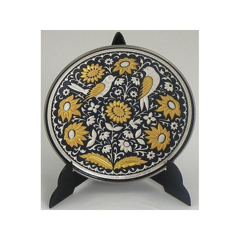 Beautiful decorative display plate with handmade gold and silver damascene design work featuring a bird and floral design. This plate is round in shape and measures 6 cm in diameter. Plate comes with a display stand at no extra cost.