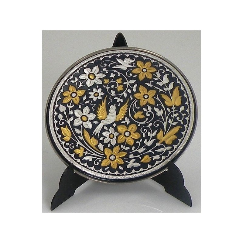 Beautiful decorative display plate with handmade gold and silver damascene design work featuring a bird and floral design. This plate is round in shape and measures 6 cm in diameter. Plate comes with a display stand at no extra cost.
