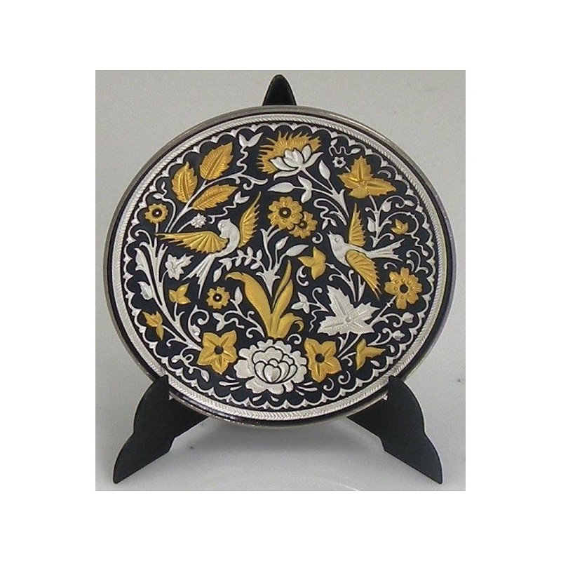 Beautiful decorative display plate with handmade gold and silver damascene design work featuring a bird and floral design. This plate is round in shape and measures 6 cm in diameter. Plate comes with a display stand at no extra cost.