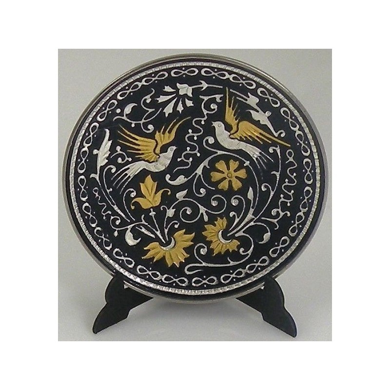 Beautiful decorative display plate with handmade gold and silver damascene design work featuring a bird and floral design. This plate is round in shape and measures 4.5 cm in diameter. Plate comes with a display stand at no extra cost.